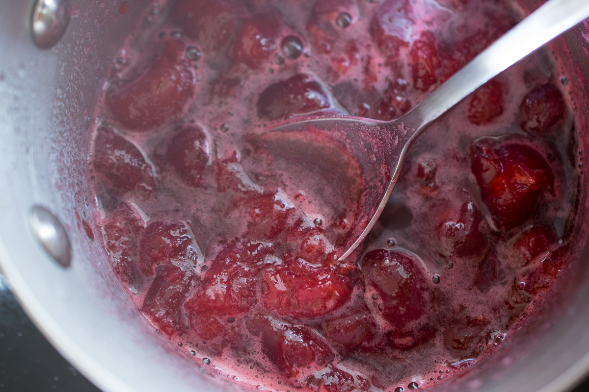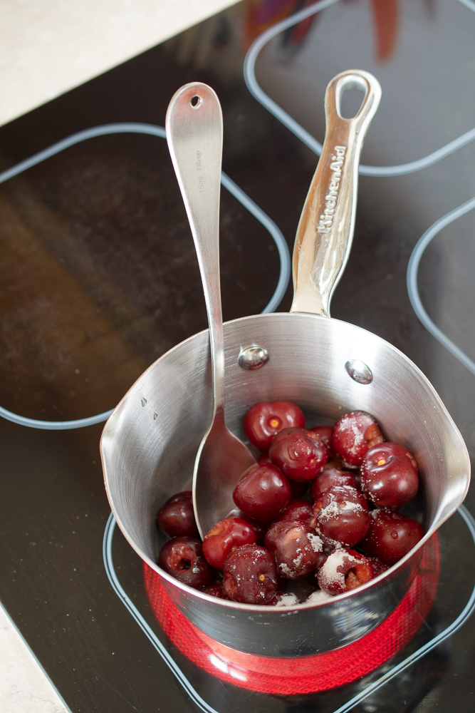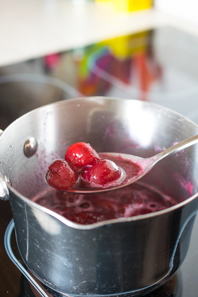 Make the coulis first. Taste the cherries to see how sweet they are then wash, stone and de-stalk the lot.