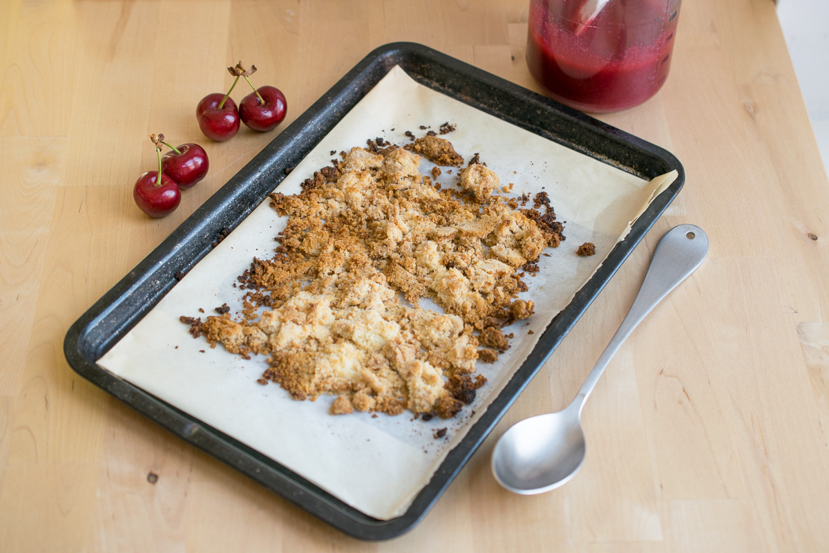 With cherry season racing up upon us, it’s rude not to make extra cherry coulis to pour over as you serve along with a few reserved chunks of crumble. Yes, you need to make the coulis and the crumble separately but both are easy steps and you don’t need an expensive ice cream machine to churn for you – there is plenty of air whipped into the ice cream as you prepare it.