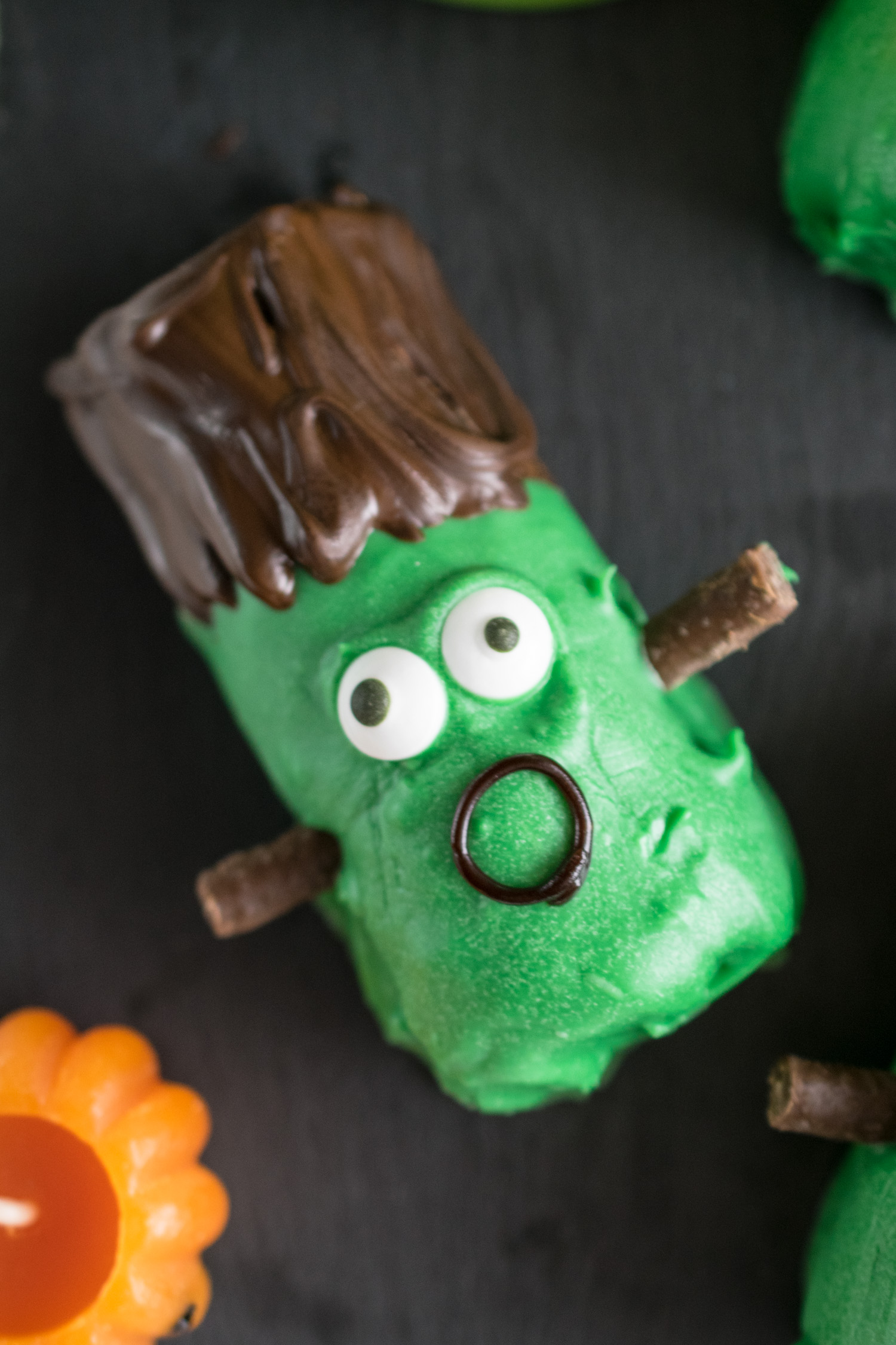 Now, take each chilled mini roll and dip it into the Candy Melts, to about 3/4 of their length then transfer to the greaseproof. Straight away, pop on two edible eyes about half way down and then push two short lengths of MatchMakers (or pretzel sticks) into the sides a little lower than the eyes to make Frankenstein's bolts. The Candy Melts set so fast it is much better to do one at a time or it will crack as you try to decorate each.