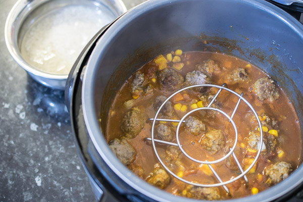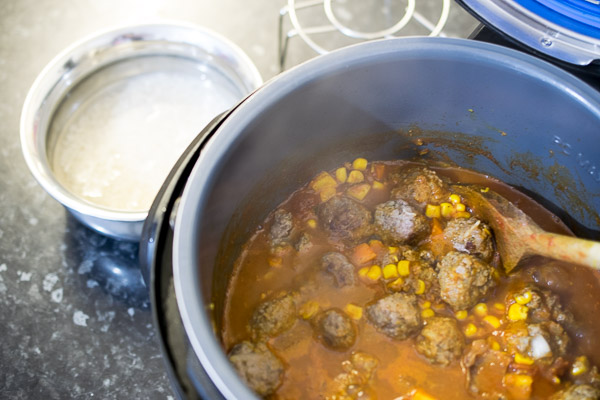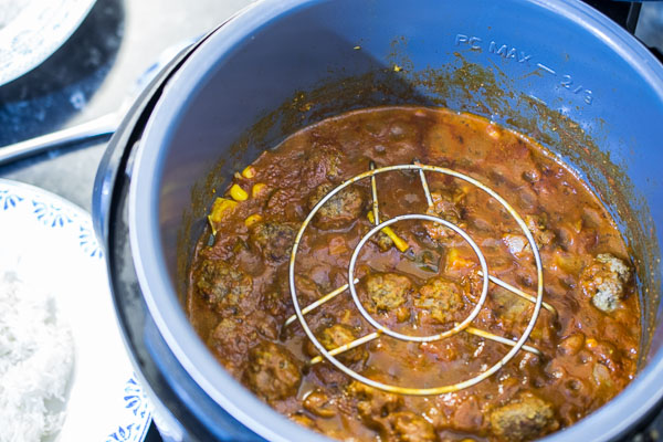Something else you mightn’t have tried before is cooking “pot-in-pot” in your Instant Pot. All this means is cooking the curry directly inside the Inner Pot then tucking a metal trivet into it, followed by a metallic bowl filled with rice and water so that you can cook a complete meal at once. Such a time (and sanity) saver!