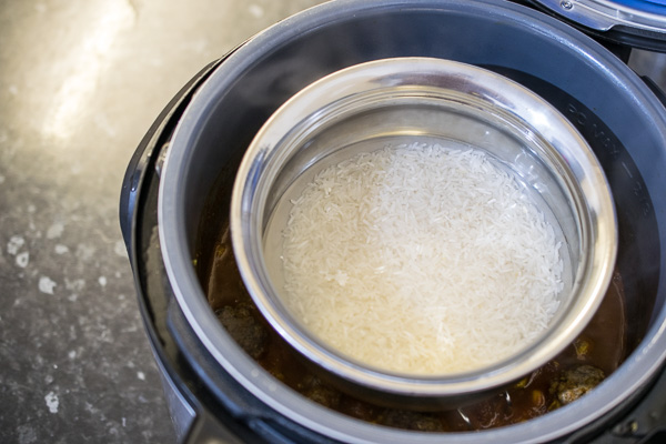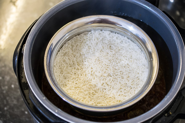 - Tuck a tall trivet into the curry sauce (one 2-3 inches tall is perfect) and place a metallic bowl like an Indian handi dish on top. Add the rice plus 1 cup of water to the bowl and stir.
