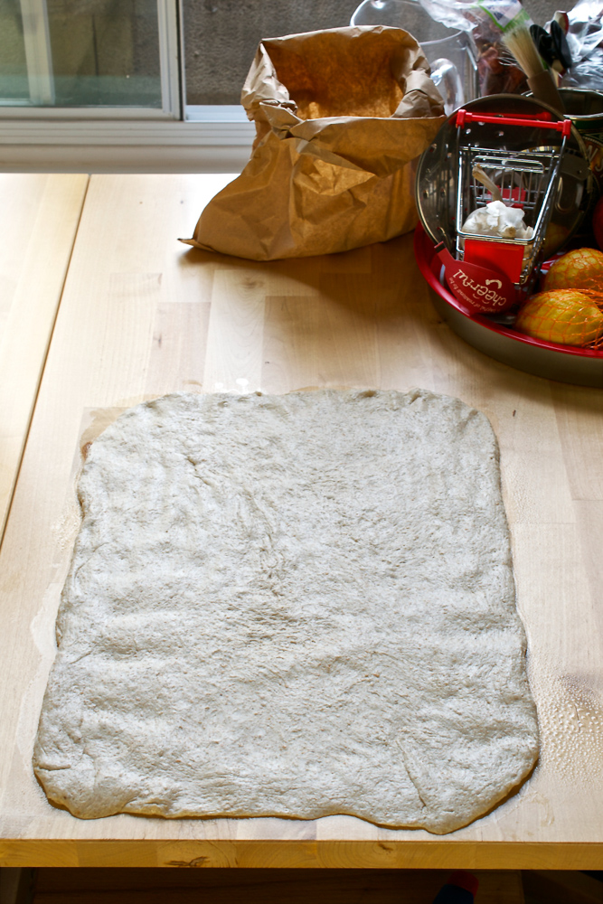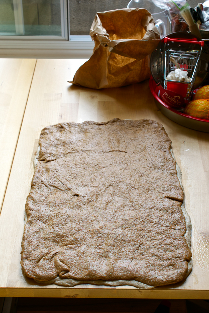 When proved, gently deflate the doughs and pat one out in a large rectangle which is as wide as your loaf tin or tins if using two. I lightly spray the work surface with oil rather than using extra flour for this purpose.