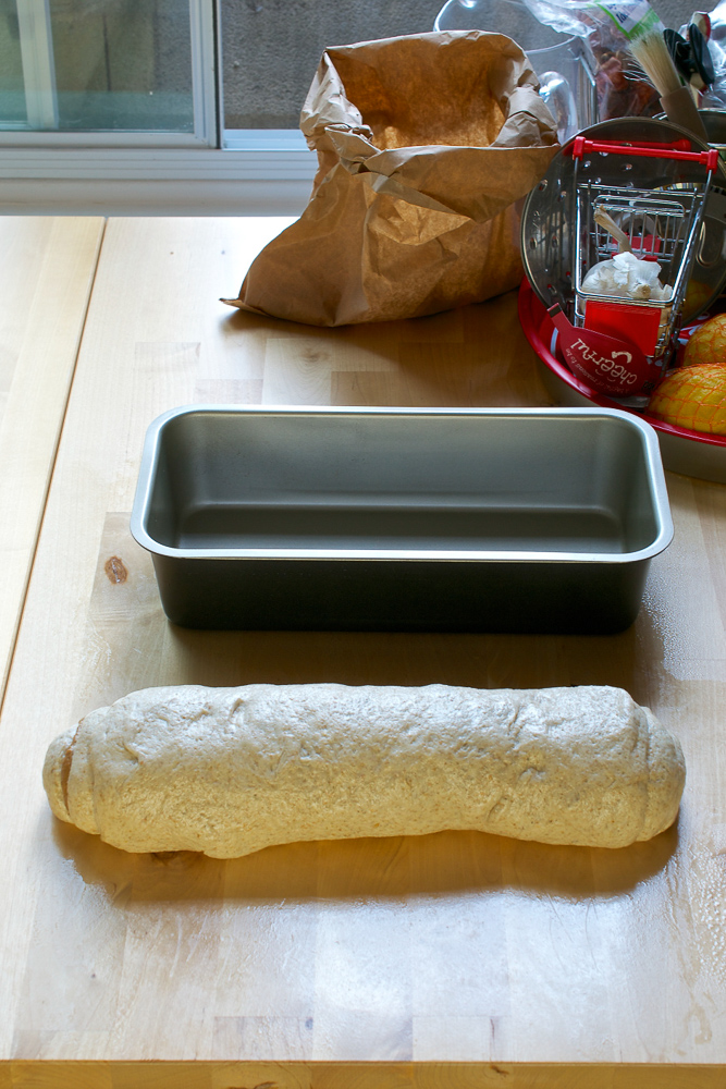 Roll up firmly, with tension developing by lightly tugging the roll away from the side which is yet to be rolled as you go. Again, it helps in preventing blow holes and gives better form to the loaf before it proves for a second time.