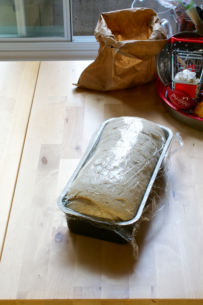If using two tins, grease a sharp knife and cut in half before putting seam side down into your tins. Cover with greased cling film allowing for room to expand – the rye gives a very good rise.