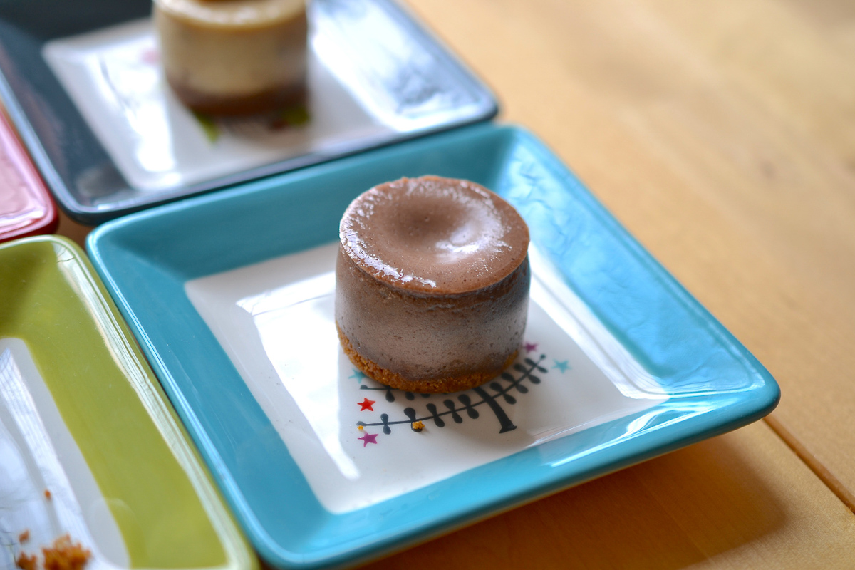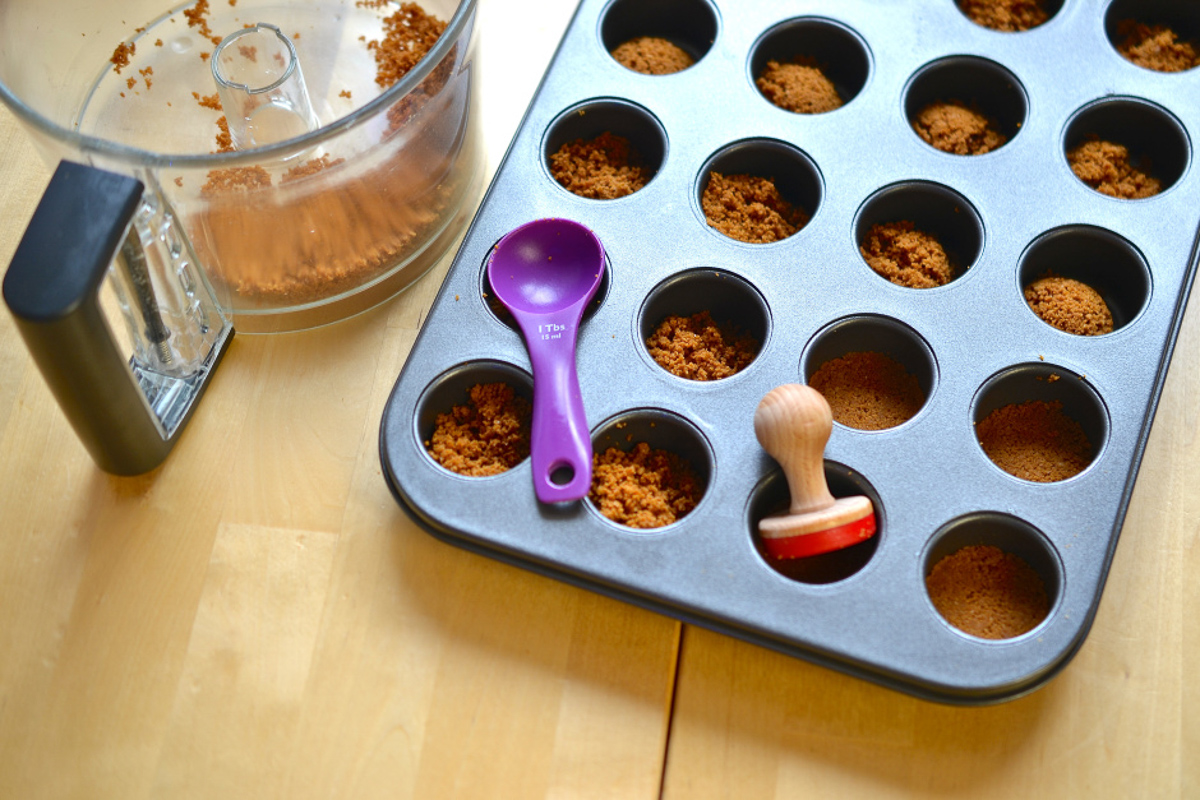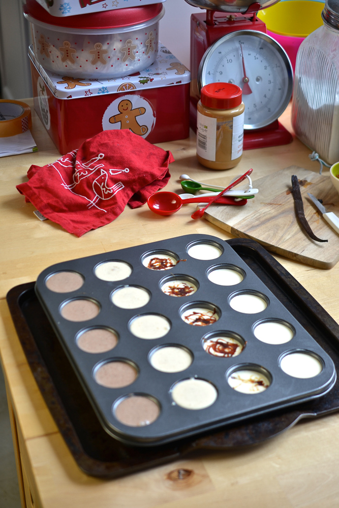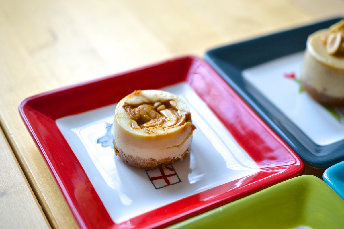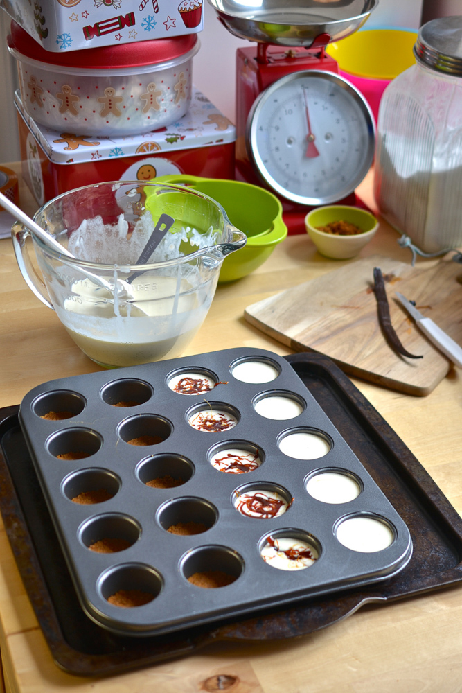 Lotus biscuits are so devilishly moreish, with their caramel and speculoos spicy loveliness. Digestives are more classic for cheesecake bases in the UK (like Graham crackers in the States) but the spiced warmth of this Dutch cousin to gingerbread and pumpkin pie makes them seasonally appropriate alternatives. I left the first row of the babycakes vanilla and simply adorned the second row by swirling in some salted caramel.