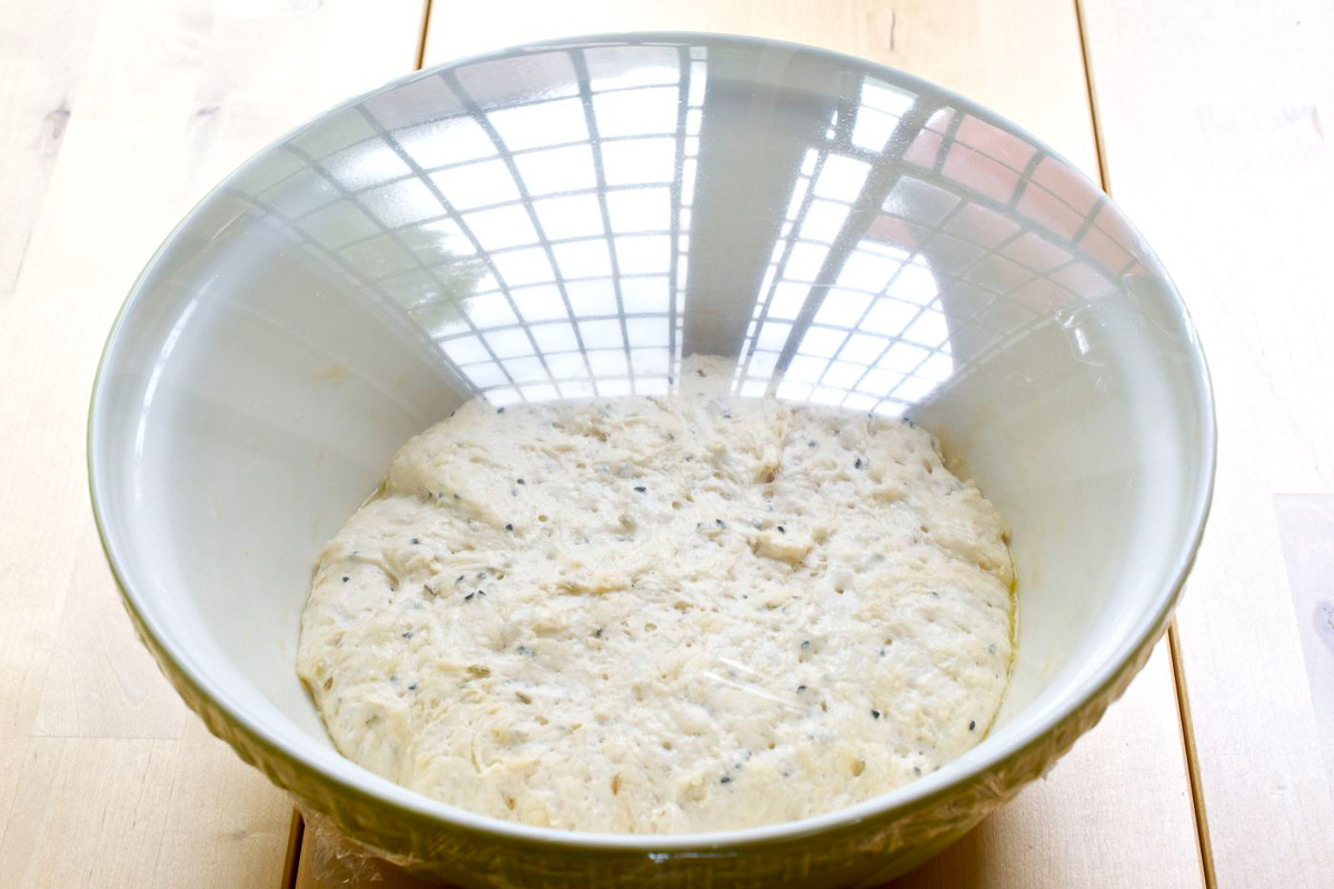 Mix to a shaggy mess in the bowl, spray lightly with oil and cover with cling film. Leave somewhere warm to prove for upto 4 hours – it will be ready when at least doubled in size but leaving it longer will only improve the flavour.