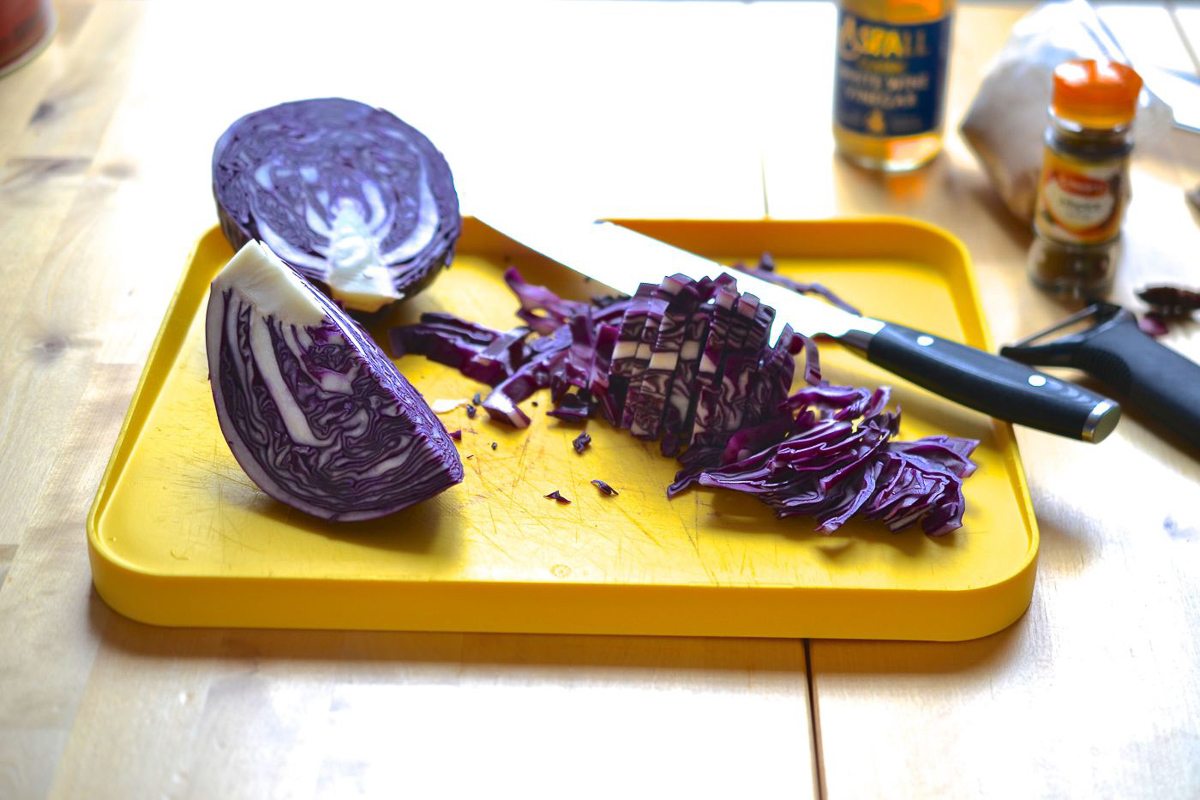 - 900 g red cabbage discard the tough core, shredded