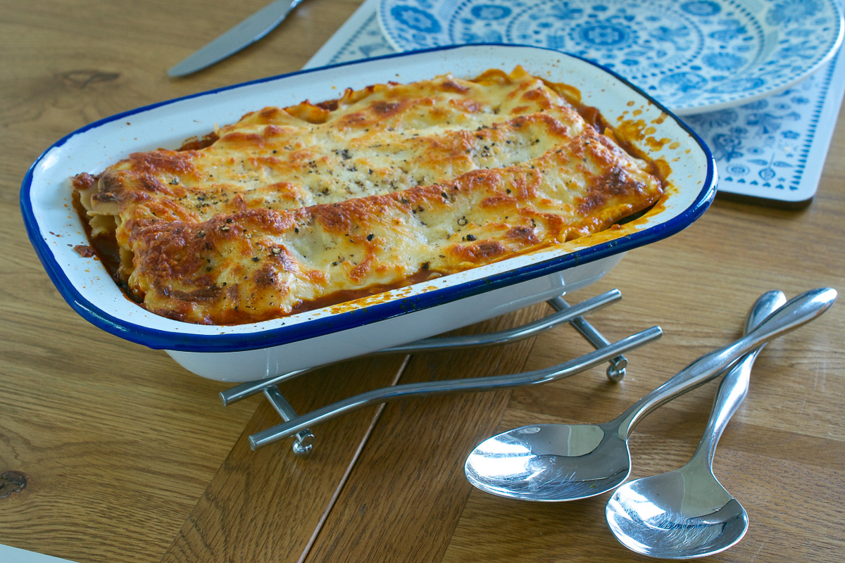 - Cook the lasagne until piping hot all the way through and the pasta cooked. 30-45 minutes at 180˚C is usually enough but keep an eye on it and cover loosely with foil if browning too quickly.