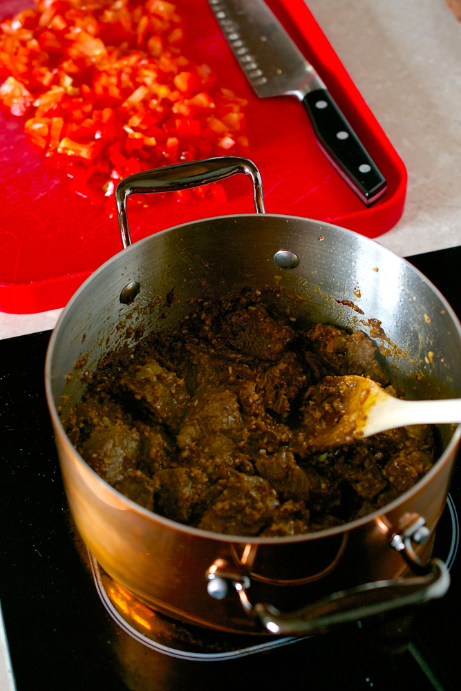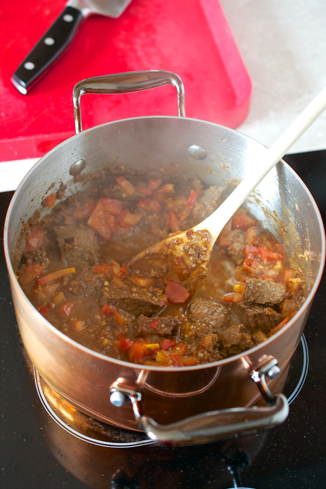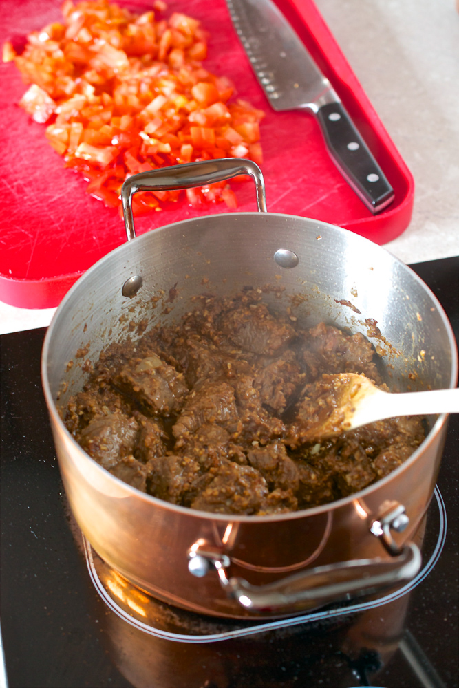 Add the beef plus the marinade clinging to it, sizzle for 5 minutes on a medium heat then add the tomatoes and water, stirring very well to combine. Simmer for 2 hours on very low, stirring maybe every 15-20 minutes to ensure it doesn’t catch. Add water if it looks dry – mine didn’t.