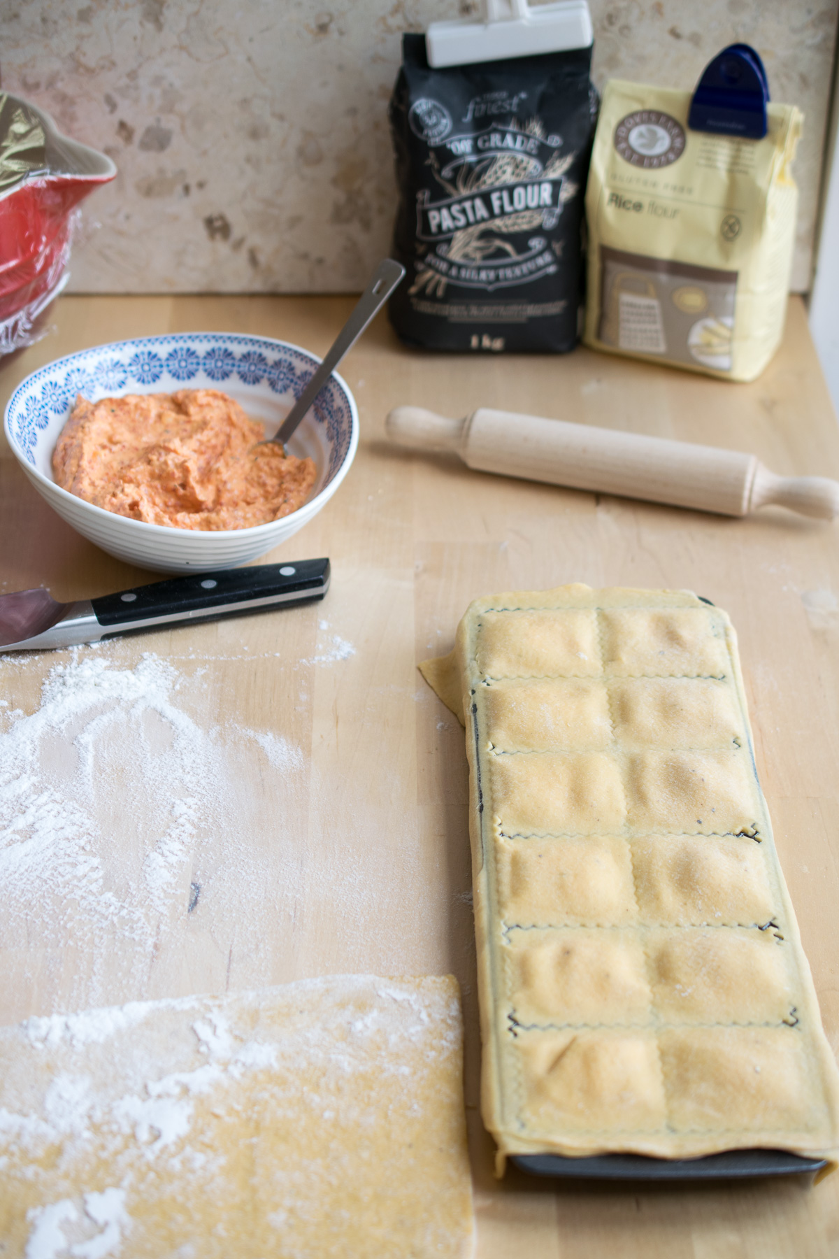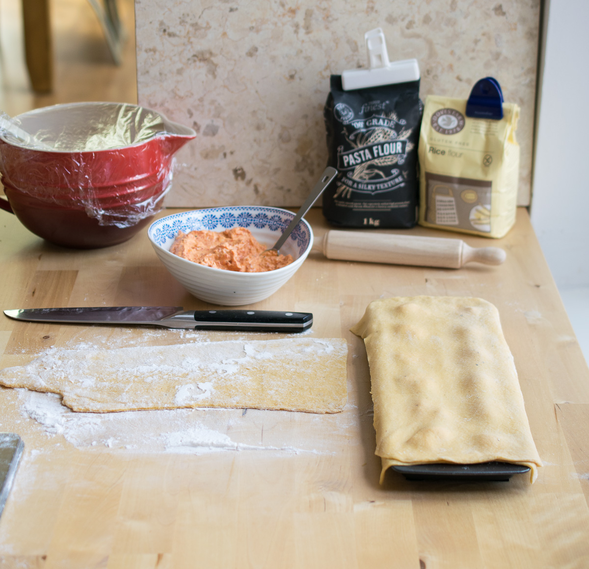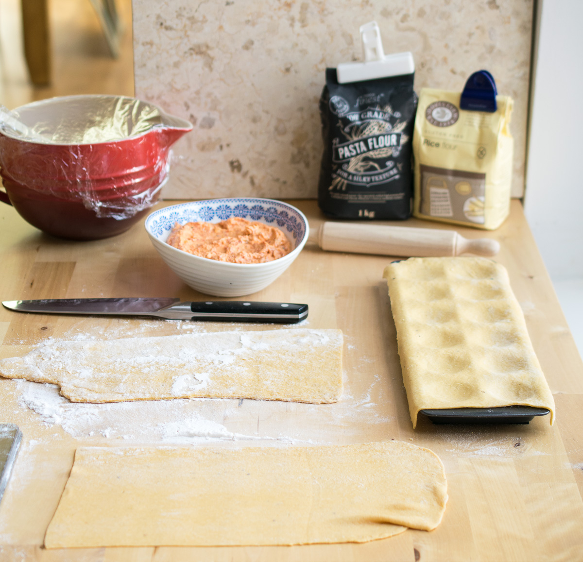 You know I love a bargain so despite coming up with the idea right at the beginning of the summer, these ravioli didn’t come to life until I recently acquired a ravioli kit in the House of Fraser sale. If I’m truthful, it is a little bit of a faff to use such a mould, especially for such a delicate filling so if you can’t stretch to yet another gadget, simply cutting out the shapes with a knife is more than satisfactory.