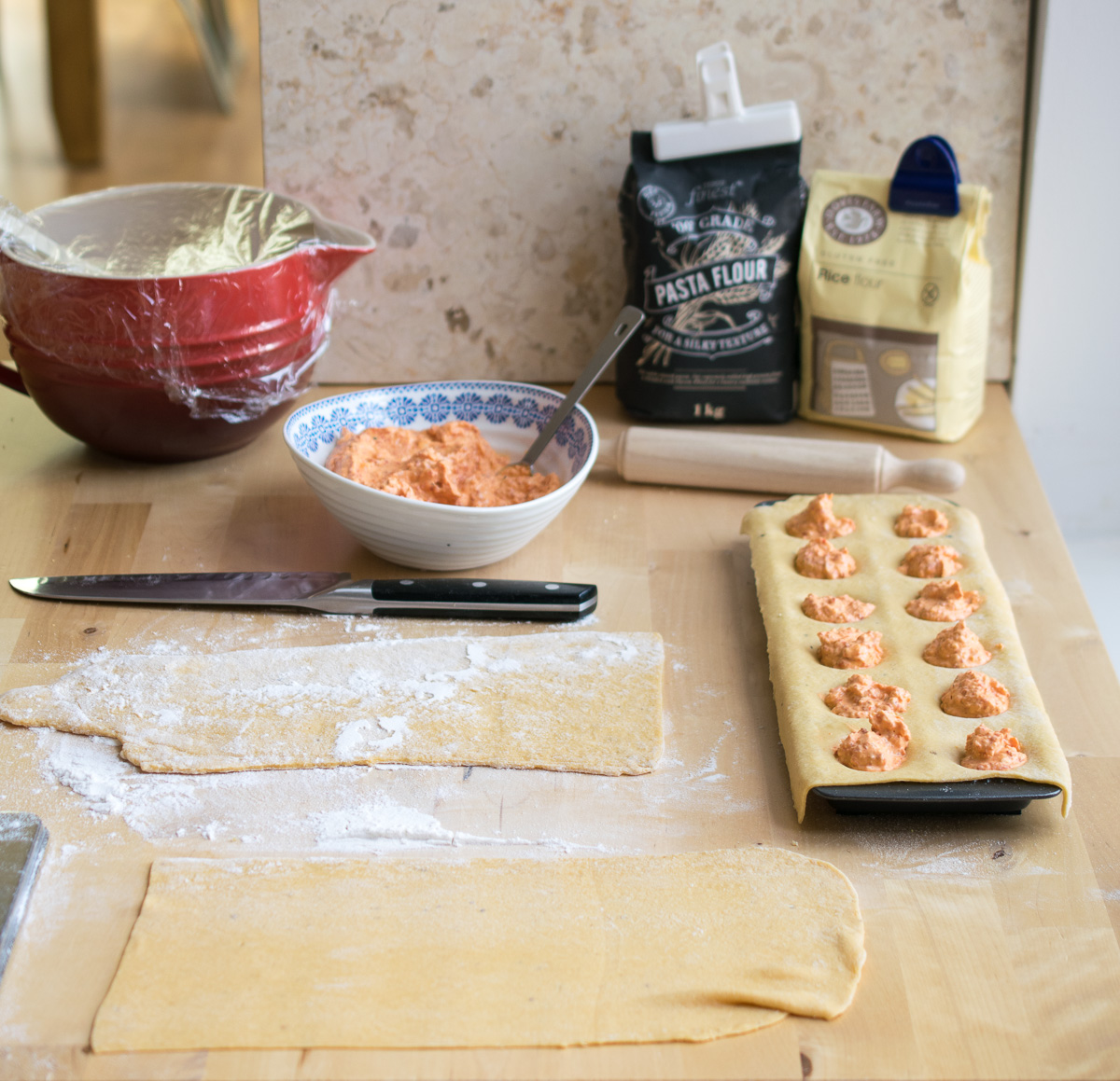 Roll the pasta through your pasta machine until very thin - using a little rice flour to dust is great in stopping it sticking to your machine and work top. Bare in mind pasta swells dramatically on cooking and you have two layers per ravioli so go thinner than usual.